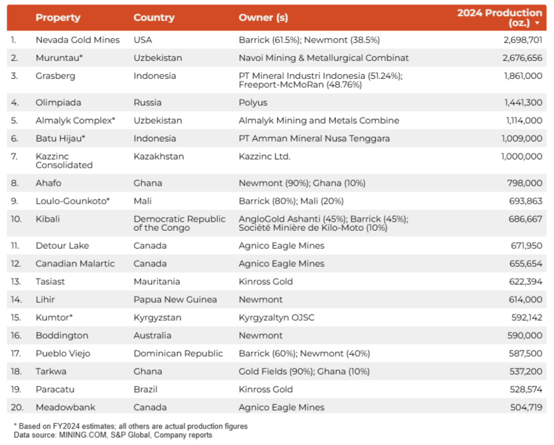 根據(jù)實(shí)際或估計(jì)的產(chǎn)量,外媒mining.com對(duì)2024年前20名黃金生產(chǎn)業(yè)務(wù)進(jìn)行排名。位于美國內(nèi)華達(dá)州的內(nèi)華達(dá)金礦(Nevada Gold Mines,簡稱NGM)2024年生產(chǎn)269.87萬盎司黃金(約84噸),是全球最大的金礦綜合體。該綜合體自加拿大黃金巨頭巴里克黃金放棄對(duì)美國競爭對(duì)手紐蒙特的敵意收購后,雙方創(chuàng)建的合資公司,將兩家公司在內(nèi)華達(dá)州的資產(chǎn)合并在一起。目前,該金礦綜合體包括10個(gè)地下礦山和12個(gè)露天礦組成,巴里克黃金(Barrick Gold)持股61.5%,紐蒙特(Newmont)持股38.5%。